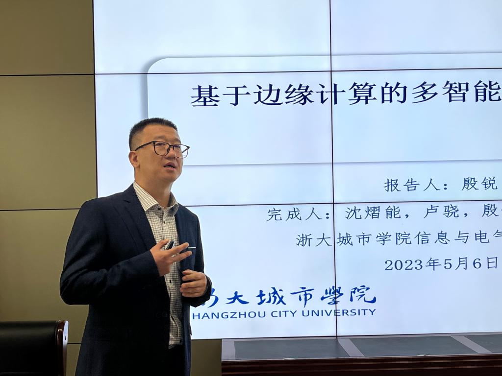 殷锐教授的学术报告是以“基于边缘计算的多智能体通信技术研究”为主题。殷教授首先介绍了浙江大学无线通信与人工智能应用实验室概况以及、研究方向以及相关成果,随后又重点围绕边缘计算、边缘智能与多智能体系统等内容进行了讲解,最后与在场师生进行了探讨。