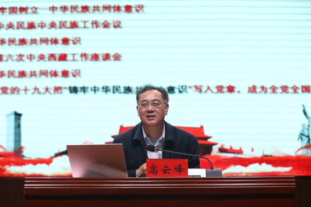 高云峰研究员从理论内涵、历史脉络、政治要求、政策表述等多个角度,深入浅出地解读了铸牢中华民族共同体意识、推行国家统编教材使用和推进通用语言文字教育的重要意义,详细解答了“怎么看”和“怎么办”两个问题。高云峰强调,各位入党积极分子要认真领会铸牢中华民族共同体意识的深刻内涵,不折不扣地贯彻党和国家的方针政策,坚决推进国家统编教材使用和国家通用语言教育,真正做到“两个维护”,做“铸牢中华民族共同体意识”坚定的维护者和忠实的践行者,凝聚起同心共筑伟大中国梦的磅礴力量,为庆祝中国共产党成立一百周年奉献青春力量。