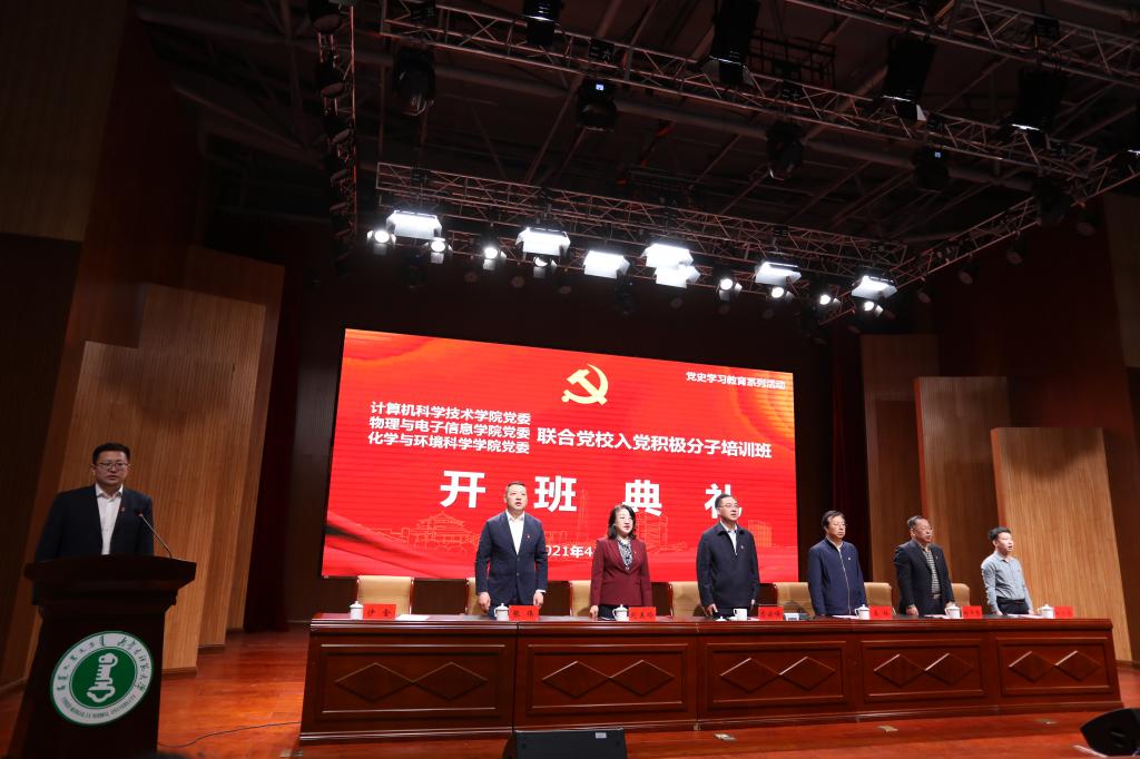 在庆祝中国共产党百年华诞的重大时刻,在“两个一百年”奋斗目标历史交汇的关键节点,全党集中开展党史学习教育之际,2021年4月10日,beat365英国官方网站党委、物理与电子信息学院党委、化学与环境科学学院党委在盛乐校区图书馆二楼报告厅联合举办2021年入党积极分子培训班开班典礼。