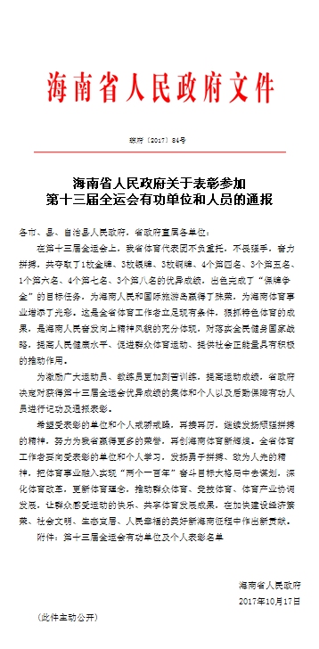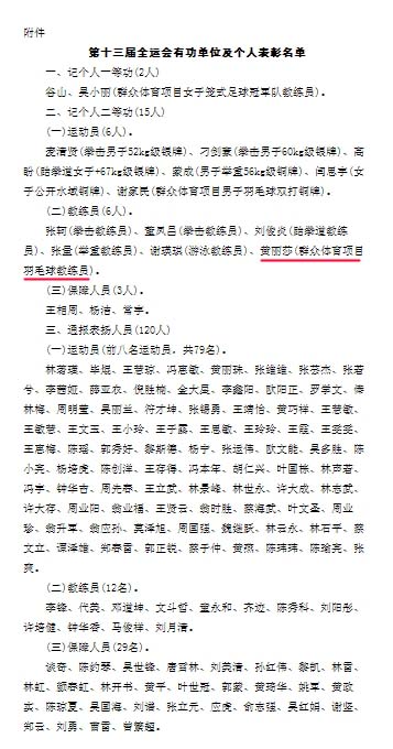 近日,海南省人民政府发布关于表彰参加第十三届全运会有功单位和人员的通报,决定对获得第十三届全运会优异成绩的集体和个人以及后勤保障有功人员进行记功及通报表彰。其中koko体育体育部黄丽莎老师作为群众体育项目羽毛球教练员获得个人表彰,记个人二等功。