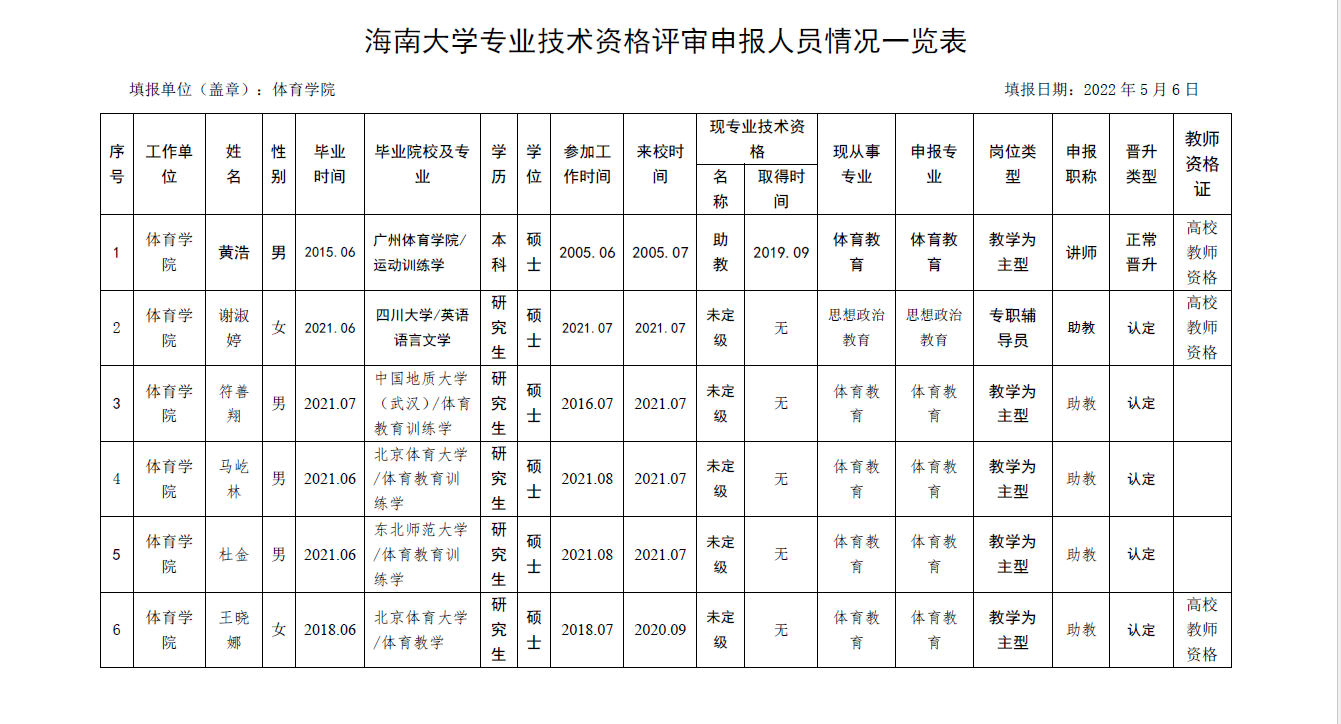 根据《海南省人力资源和社会保障厅关于我省事业单位岗位设置管理有关问题的通知》(琼人社发[2013]54号),《koko体育官网岗位设置及聘用方案(修订)》(海大[2020]103号)等相关要求,由教职工本人申请,共有6名教师提出2022年度专业岗位聘用申请、10名教师提出专业技术评审和认定申请, 学院基层评审委员会审核,并票决全部通过。具体名单如下: