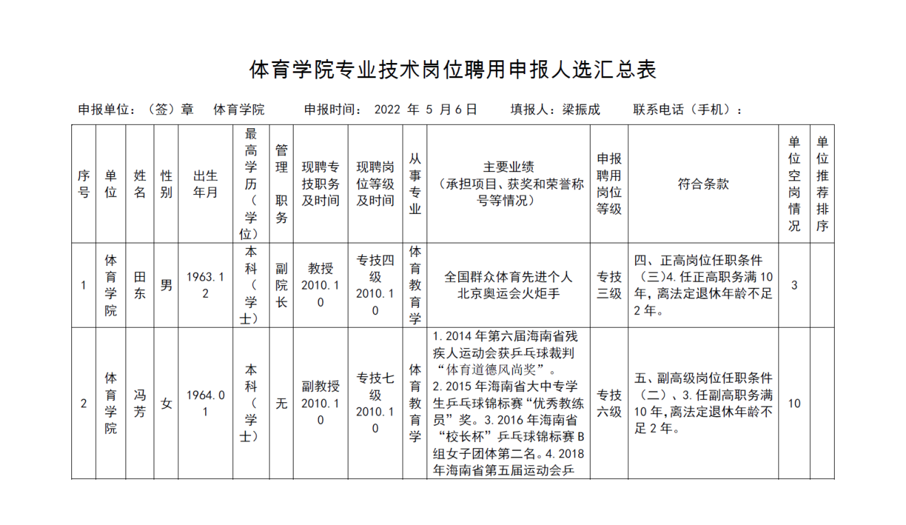 《 koko体育官网专业技术岗位聘用申报人选汇总表》