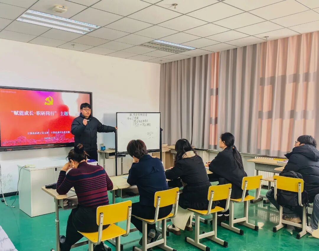毕业季面对就业的关键抉择,不少学子倍感迷茫。为切实解决学生成长痛点,发挥教工党支部教学优势与学生党支部朋辈作用,2025 年 12 月 2 日上午 9 点,计算机系教工党支部联合学生党支部在理工楼 813 教室,开展 “赋能成长・职研同行” 主题党日活动。计算机系教工党支部书记苟燕、教师党员萨茹拉、王素坤,学生党支部书记陈红以及计算机系2022级学生党员参加本次活动。