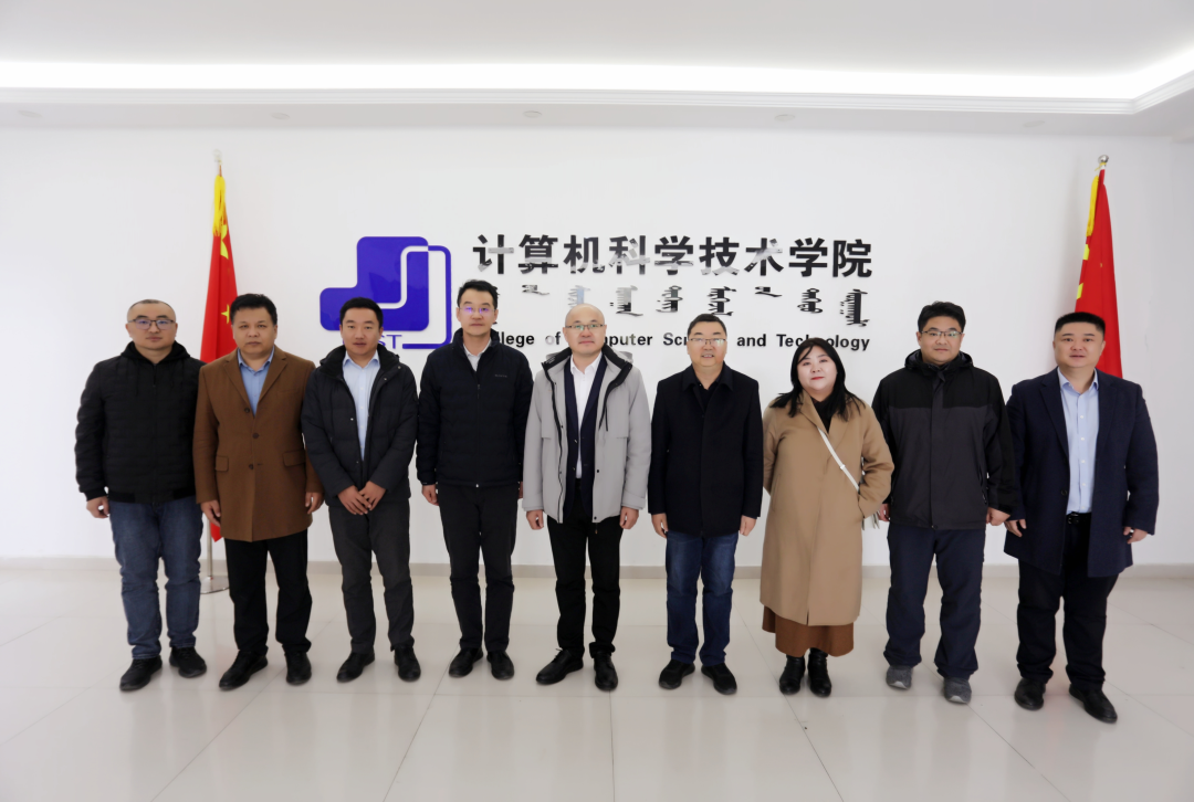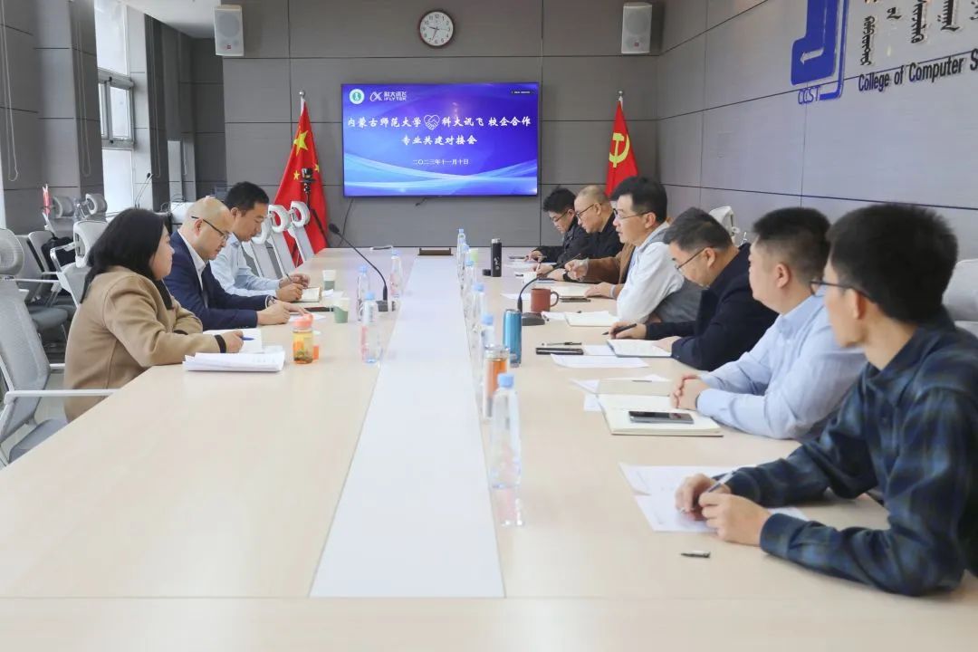 科大讯飞内蒙古大区总经理刘平、高教人才培养市场总监程含含(线上) 高教人才培养业务区域总监王家波(线上)、内蒙古大区渠道总监吴丹、内蒙古大区城市经理门少春。学院党委书记王海龙,院长林民、副院长斯琴图等相关部门负责人和教师代表参加对接会。