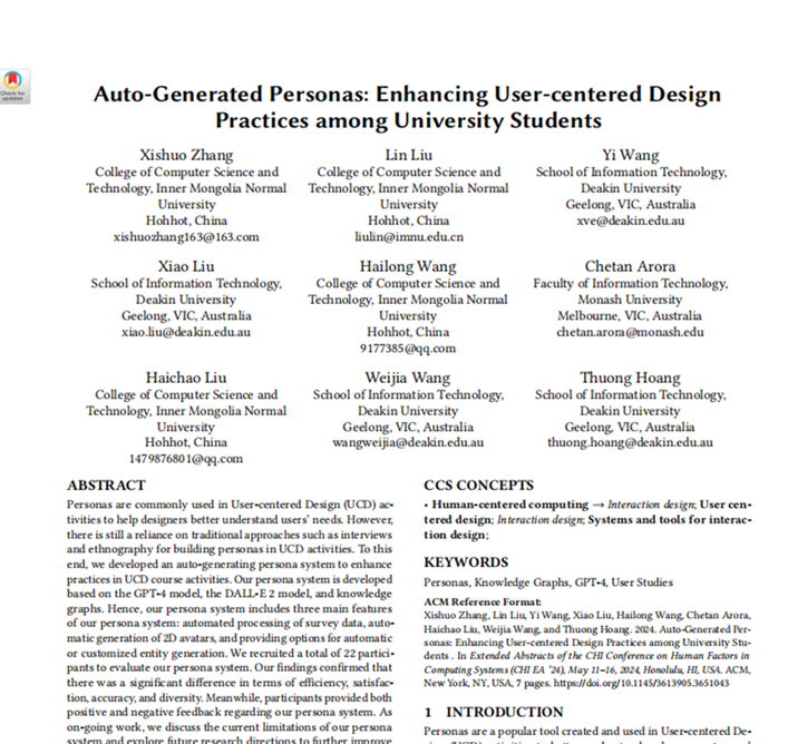 近日,beat3652022级计算机科学与技术专业研究生张西硕以第一作者身份在国际权威学术会议ACM Conference on Human Factors in Computing Systems发表研究论文Auto-Generated Personas: Enhancing User-centered Design Practices among University Students