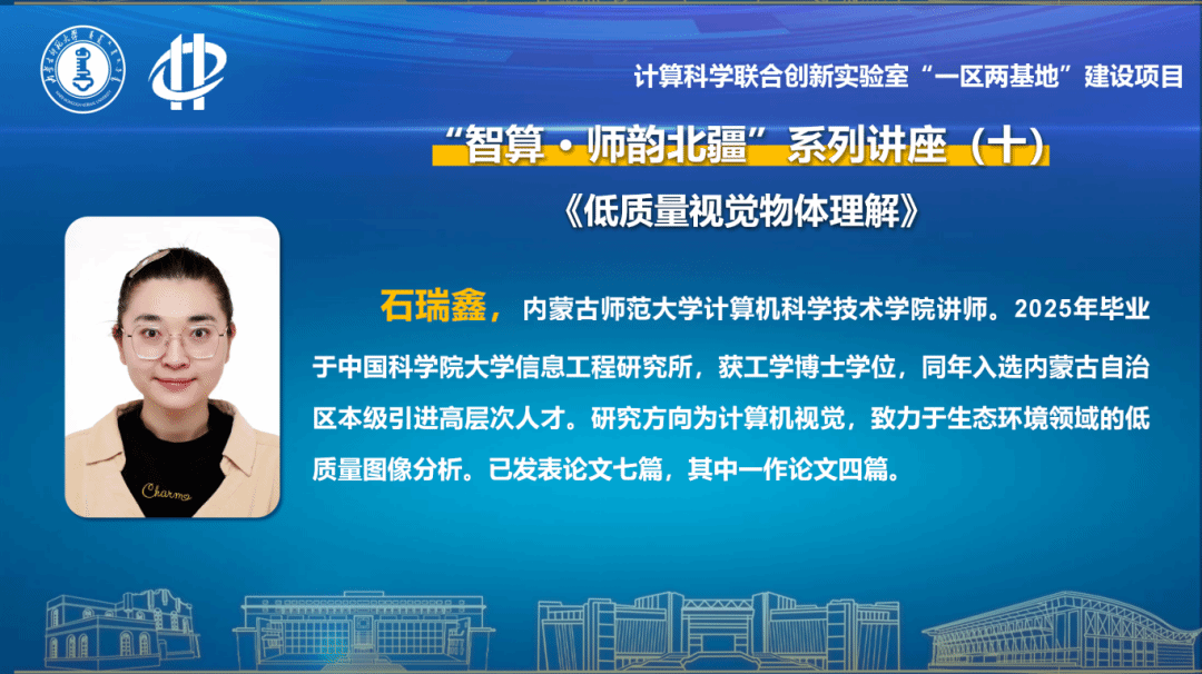 2025年12月1日下午,beat365英国官方网站“智算·师韵北疆”系列讲座第十期在盛乐校区大数据楼114教室顺利举行。本期讲座特邀该院石瑞鑫老师担任主讲,作题为《低质量视觉物体理解》的学术报告。
